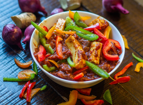 Veg Jalfrezi is a vibrant, stir-fried vegetable curry made with a mix of fresh vegetables like bell peppers, carrots, peas, and onions. The vegetables are cooked in a tangy, slightly spicy sauce with tomatoes, ginger, garlic, and a blend of spices. The dish has a stir-fry texture. with the vegetables retaining their crunch. offering a flavourful.